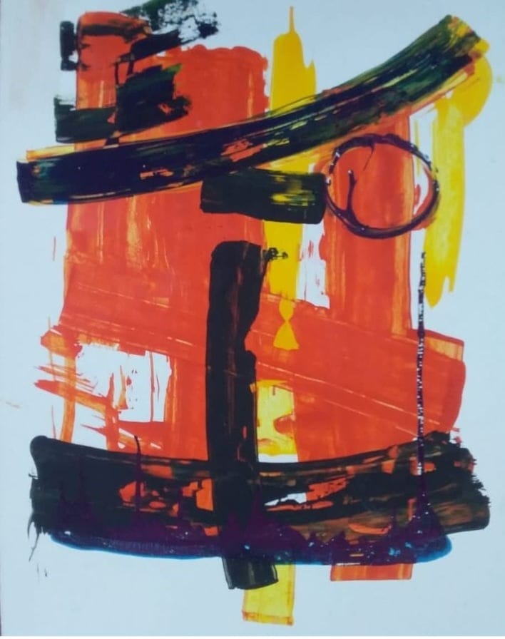 أما العمل الثاني، فيفيض بطاقة لونية حارة؛ الأحمر والبرتقالي والأصفر تتوهج ككتلة ضوء متحرك، بينما تقطعها ضربات سوداء عريضة تمنح التكوين ثقلاً بصريًا مقصودًا. هنا يتحول اللون إلى انفعال مباشر، وإلى لغة تعبيرية خالصة. التوتر بين الخلفية المشتعلة والخطوط الداكنة يولّد إيقاعًا داخليًا يعكس حساسية الفنان تجاه التوازن بين الانطلاق والاحتواء، بين العفوية والضبط.