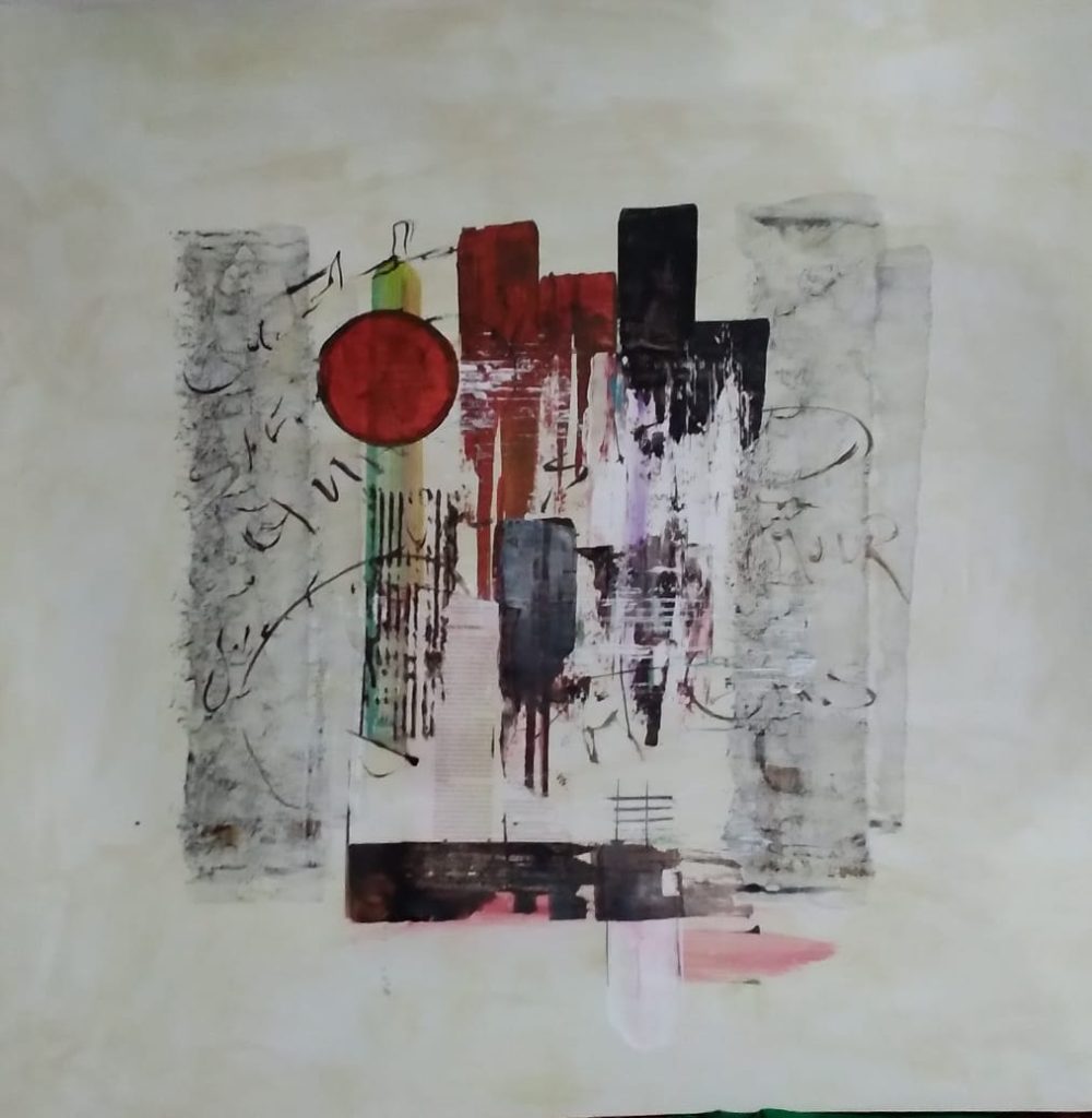 عند قراءة أعماله، كما تبدو في النماذج المعروضة، يتجلى انحيازه الواضح إلى التجريد بوصفه أفقًا للتعبير الحر. في العمل الأول، تتوسط دائرة حمراء التكوين، كأنها بؤرة شعورية تشدّ العناصر المتناثرة إليها. تتجاور الكتل اللونية العمودية، وتتداخل الآثار الخطية مع المساحات البيضاء والرمادية، في بناء يشي بحوار داخلي بين النظام والفوضى. لا تبدو اللوحة مجرد ترتيب للأشكال، بل مساحة لصراع صامت بين الامتلاء والفراغ، بين الكثافة والخفة.